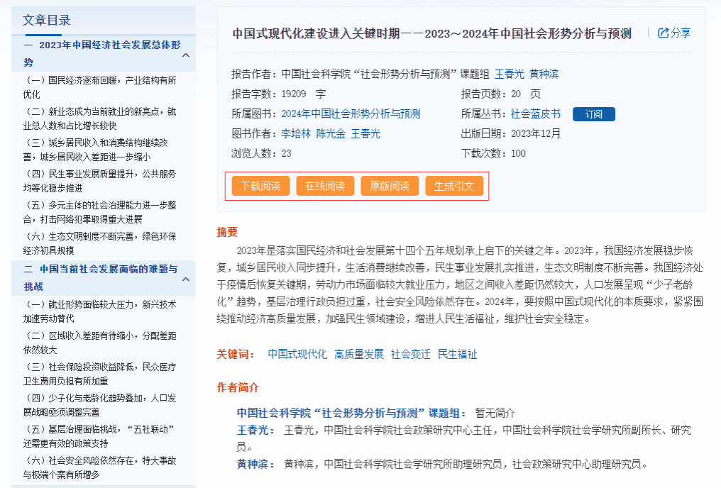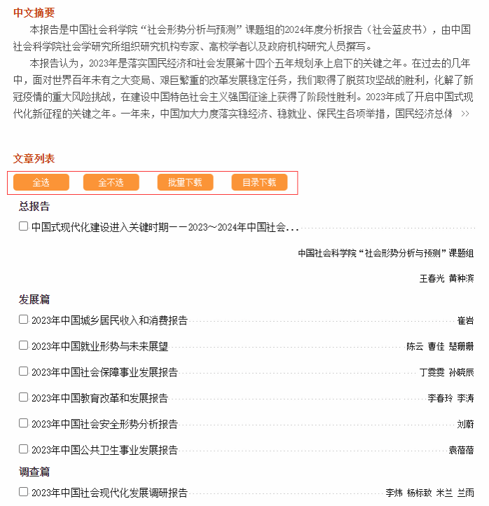 可点进任意图书标题进入图书信息页,批量下载全部或者多篇报告。