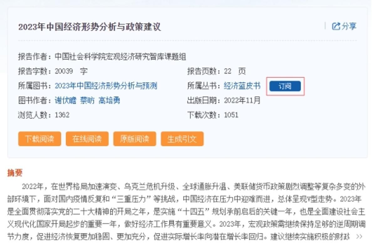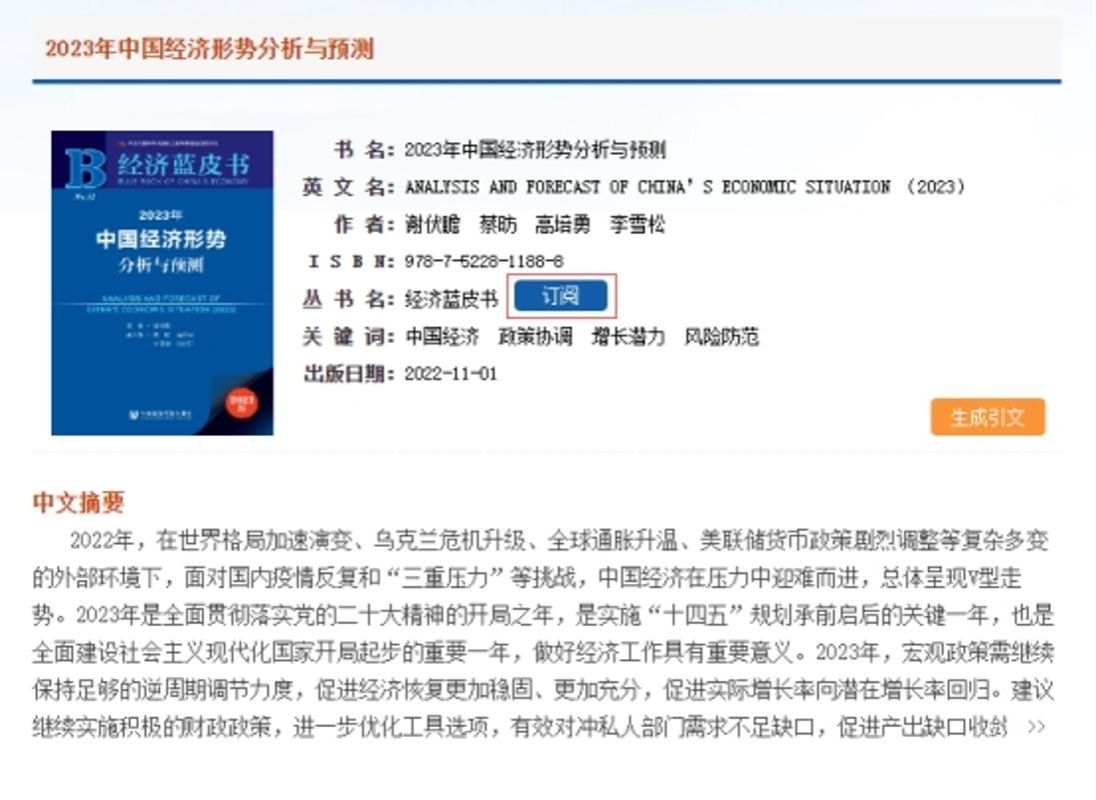 皮书数据库在图书信息页、报告信息页、皮书分类页、丛书信息页等页面均设置有订阅按钮,方便在浏览时随时订阅感兴趣的皮书。