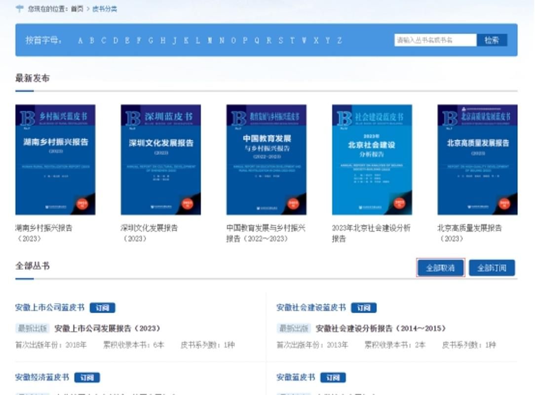 如想订阅皮书数据库中的所有皮书,请进入皮书分类页选择全部订阅,用户也可在同一页面点击“全部取消”取消该操作。