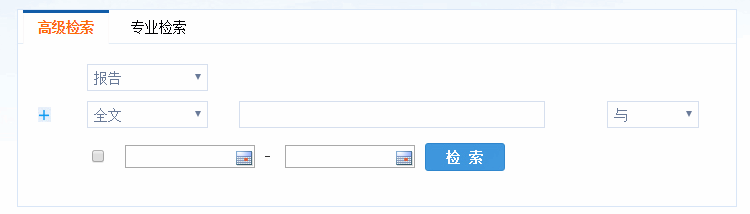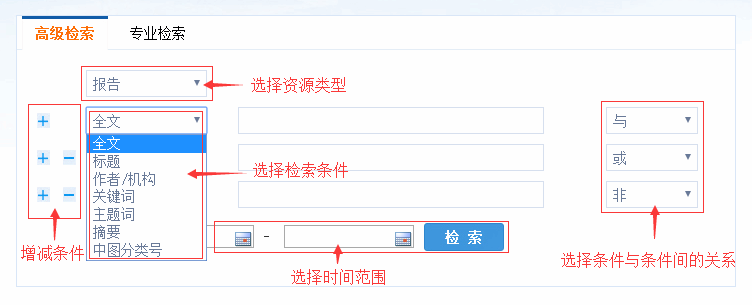 高级检索功能:支持多条件组合检索,包括自由选择检索资源类型(报告、图书、图表、视频)、自由增减条件项、自由定义条件项内容(全文、标题、作者、摘要、关键词、中图分类号)、自由定义组合条件关系(与、或、非)、自由选择查找时间范围。
