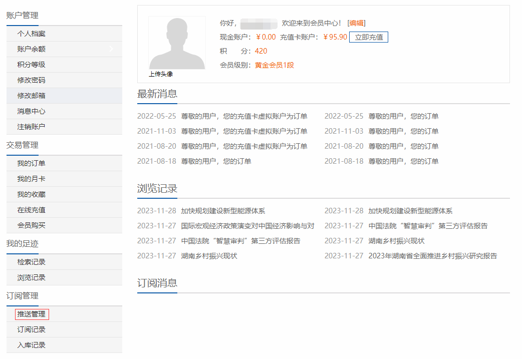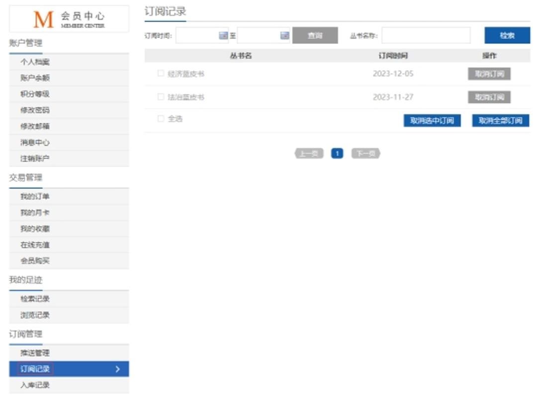 可在会员中心-订阅管理-订阅记录中管理订阅的皮书,支持按订阅时间、丛书名称查询检索,支持单一或批量取消订阅。