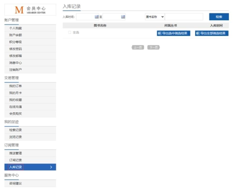 也可在图书信息页、报告信息页、皮书分类页、丛书信息页等页面取消已订阅皮书。可在会员中心- 订阅管理-入库记录中查看订阅皮书的更新情况,支持按更新时间、图书名称查询检索,支持导出选中/ 全部更新结果,点击图书名称可直接访问订阅皮书。也可通过邮箱 /手机接收到的订阅信息,直接访问订阅皮书。