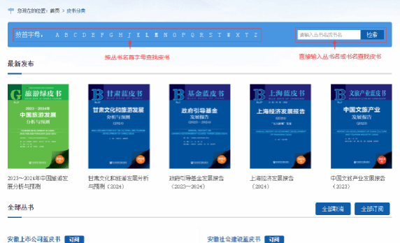 支持按丛书名首字母查找、浏览皮书,也可直接输入丛书名或书名查找皮书。