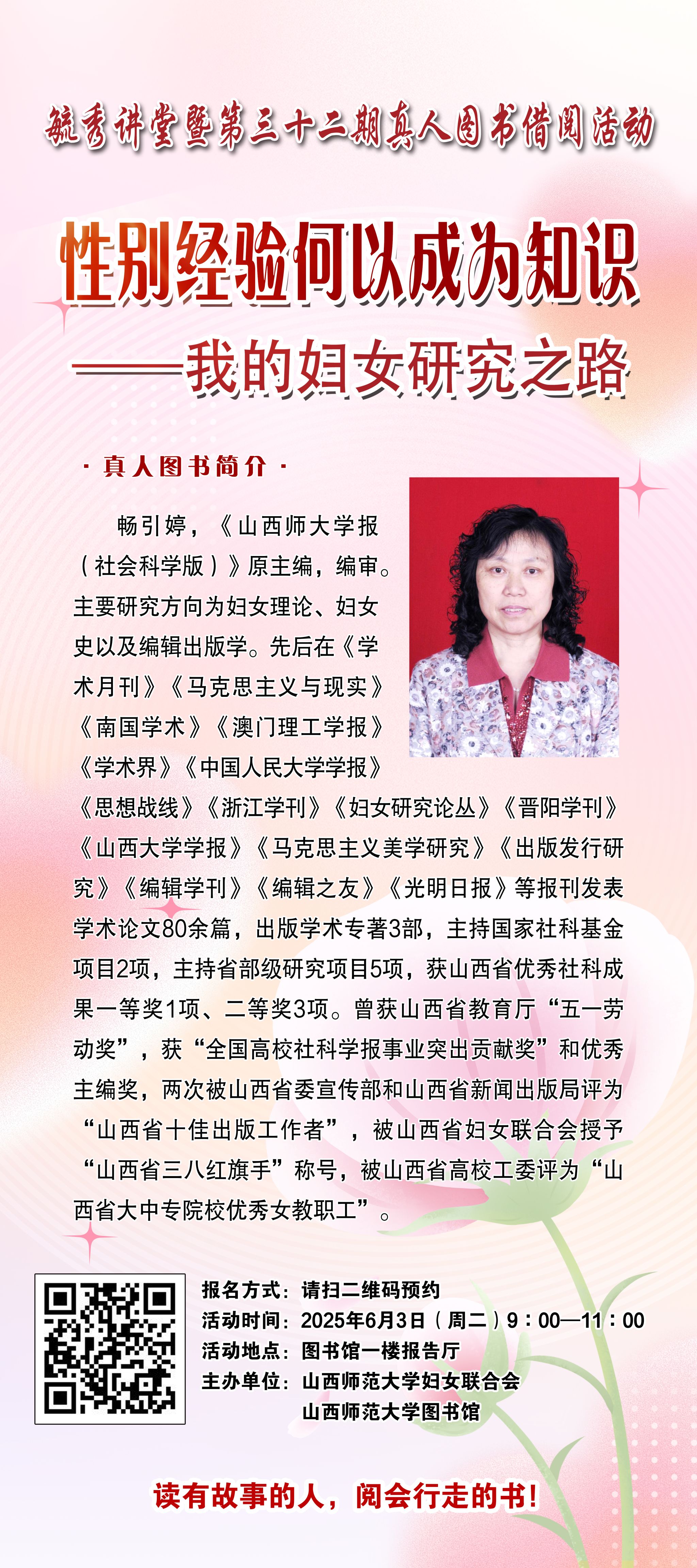 如果你渴望深入了解妇女研究,对性别经验转化为知识的过程充满好奇,欢迎加入我们的活动。在毓秀讲堂,翻开畅老师这本“真人图书”,开启一场别开生面的知识探索之旅,共同领略妇女研究的魅力,为推动性别平等与妇女发展贡献智慧与力量!