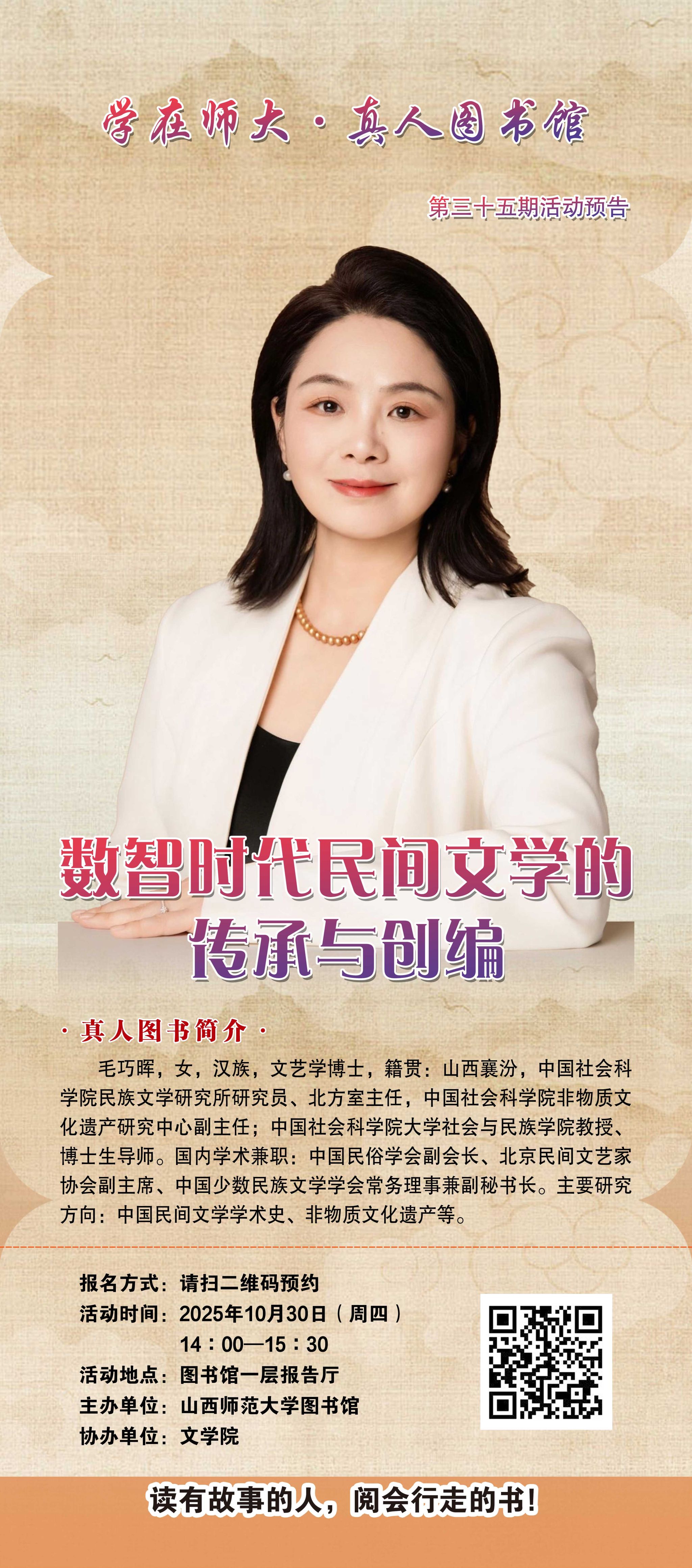 当AI浪潮席卷生活,古老的民间故事、神话传说如何突破时空桎梏?当学术研究遇上社会热点,民俗学又能绽放怎样的时代光彩?本次真人图书馆活动,图书馆联合文学院特别邀请到中国社会科学院民族文学研究员毛巧晖这位重磅“真人图书”,用深耕民俗学领域的亲身经历,带大家走进民间文学的传承与创编世界。