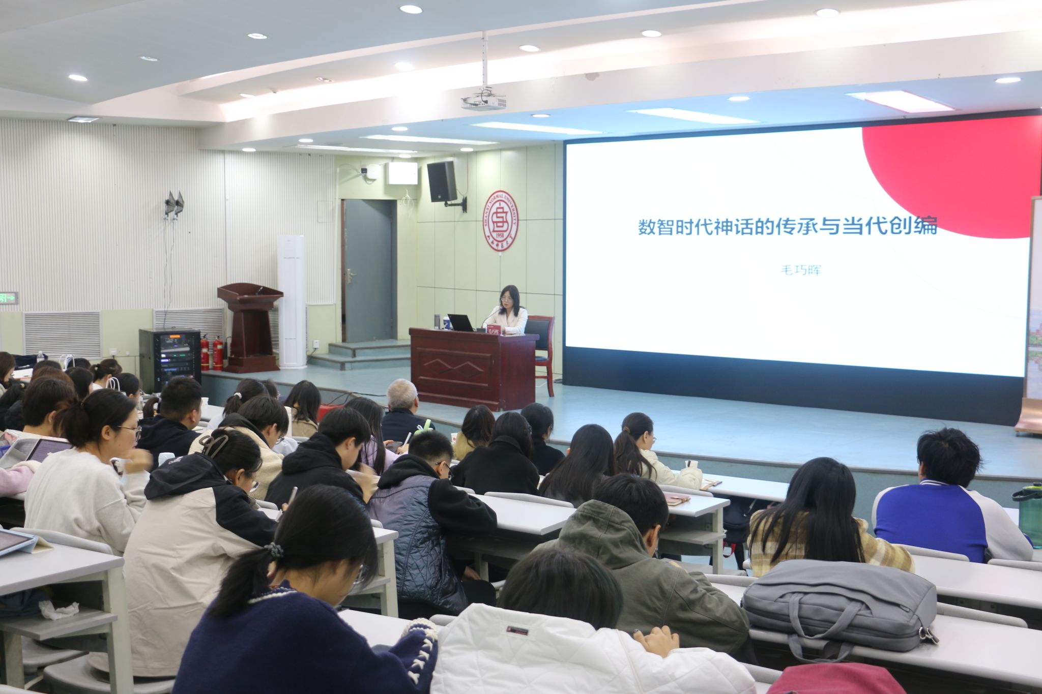 随后,毛老师围绕“传统研究对接学术前沿与社会热点”这一核心,展开了精彩解析。她以叶永烈先生的《小灵通》为例,提出“神话是古人的科学”这一新颖视角,带领大家重新审视民间文学的价值。为了让大家更直观地感受民间文化的魅力,毛老师还现场播放了“神授艺人”在国际会议上的精彩表演。她指出,民间文学并非尘封的历史,而是能够与当代社会对话的活态文化,通过跨领域融合,便能挖掘出其在当下的创新路径。