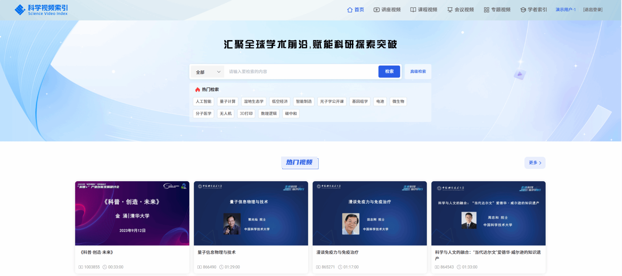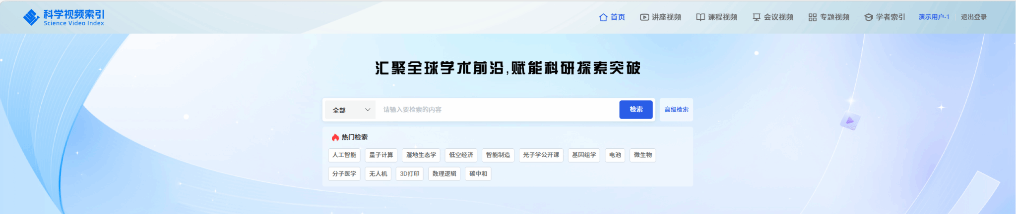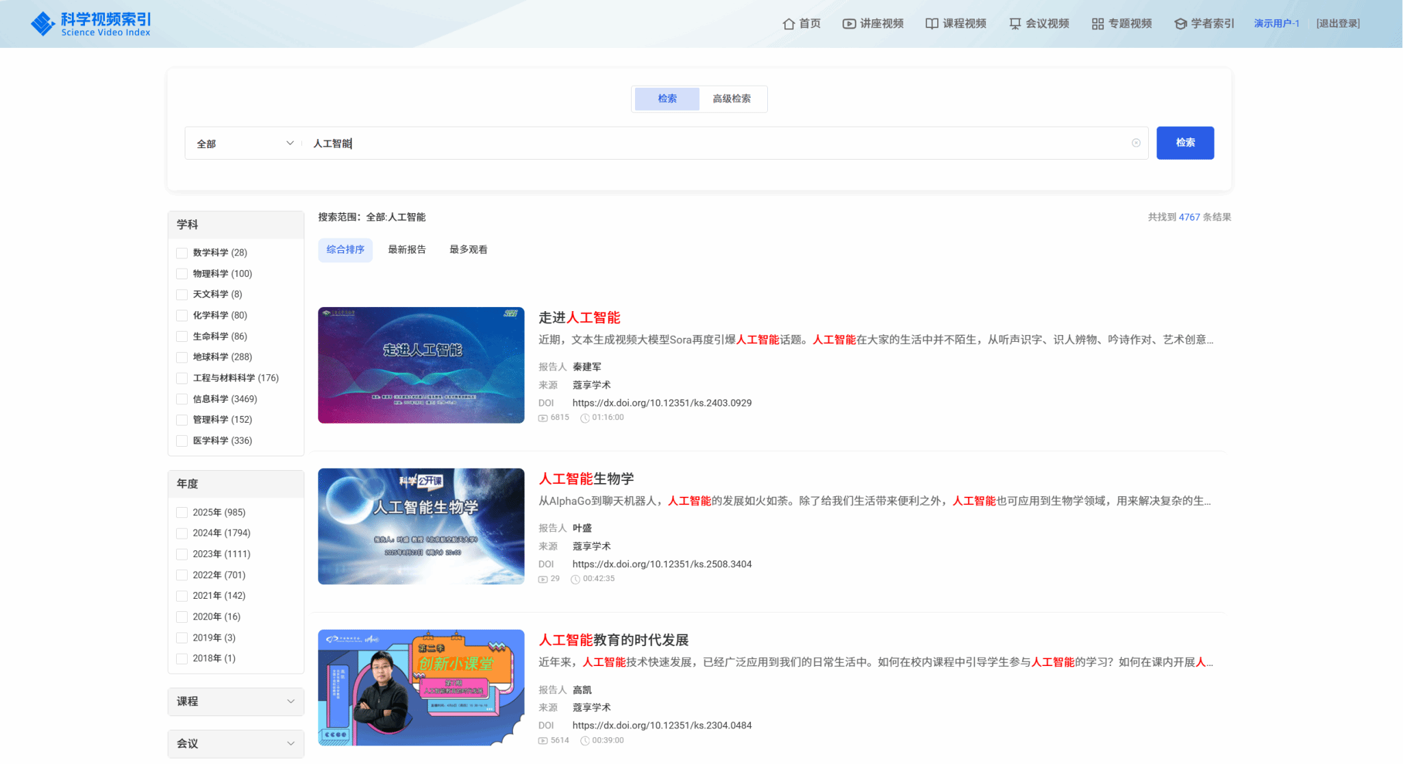SVI(Science Video Index)科学视频索引数据库由国内外多个领域的专家学者团队历时7年联合打造完成,是国际上首个专注于自然科学领域的学术视频索引数据库。团队成员通过严格的评选标准和筛选机制,精选整理了海量分散于全球各处的优质学术视频,索引链接全球科研领域高质量学术讲座30000余条、精品课程3000余节、3300余场国内外知名学术会议,包含32000余条会议实录视频,总计超过8万条视频元数据(数据还在持续筛选增加中)。通过智能标引、语义化组织、跨学科关联与多语言检索,构建了学术视频元数据的中央仓储,提升了用户搜集、筛选、利用视频的效率。SVI科学视频索引数据库不仅可以帮助用户及时掌握各学科最新研究动态、前沿观点,还能够为广大高校、科研机构的图书馆智能化、数字化建设提供强有力的支撑。